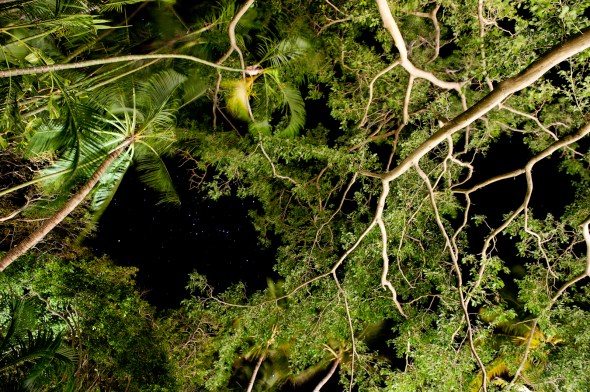 Finding a hole in the conspiracy of dense vegetation that stretches skyward, I spy Orion’s belt (the pot), just before the recycled water system gives me a thorough dosing. A vision of the island’s water treatment station flashes into mind, eclipsing my cane toad issues.