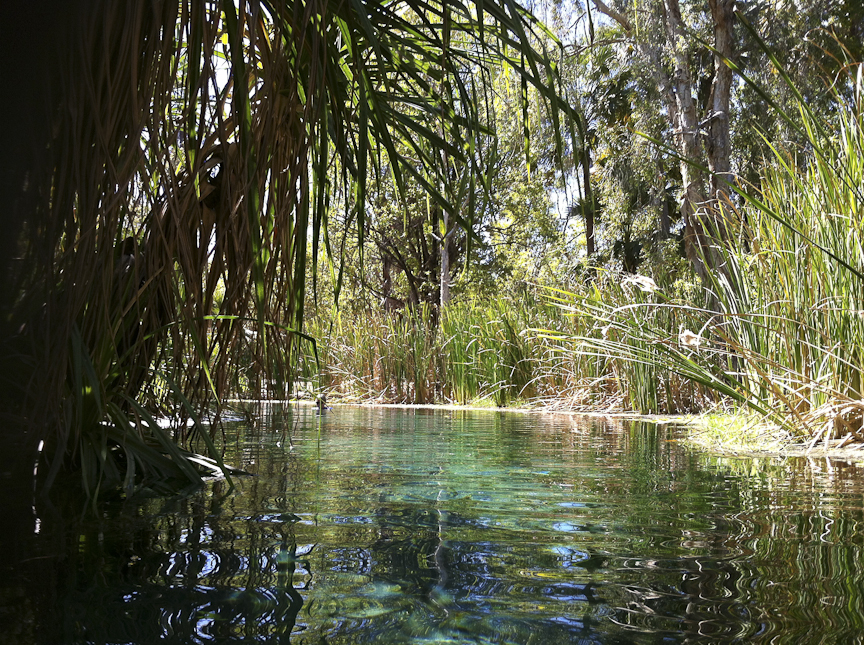 Natural hot springs can be found about 110kms south of Katherine, just off the Stuart Highway. Choosing Mataranka, we picked our way around the bunch of people that make a career of finding public hot pools, clinging to the entry and exit steps, and giggling nervously about not being able to swim. Taking our place in the pool next to all the other sardines, we pretended not to hear blush-worthy conversation, fought the urge to stare at others body parts, and scowl at those amongst us Most Likely to Pee. I lasted about 1 second longer than W, threatening to transform the tranquility into a wave pool by fidgeting, for a grand total of 5 minutes. Hopes still high, we decided the much lower profile Bitter Springs was worth a visit. The brief summary of Bitter Springs in our tour guide ill-prepared us for our visit. Stepping into a narrow creek fringed by palms, the warm, crystal clear, deep teal, water slowly flowed, carrying us along with it. Small turtles slept on the exposed tree roots. A water monitor lazed warily on the bank. It was like that Theme Park water ride where you float around in a current on tubes, but without the screaming, garish tones, and fibreglass.