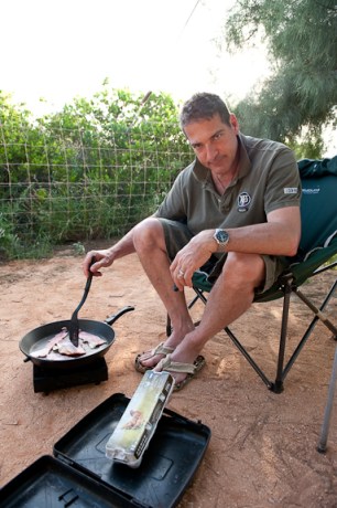 By the time we reached Exmouth, it was time to delve into the dodgy depths of our two chilly bins. Chicken and pork fillets had been on slow defrost since we left a week earlier, and it was D-Day. We decided wrapping everything in prosciutto and frying the heck out of it would kill or mask potential bacteria and so it was that we feasted on pig wrapped in pig that night.